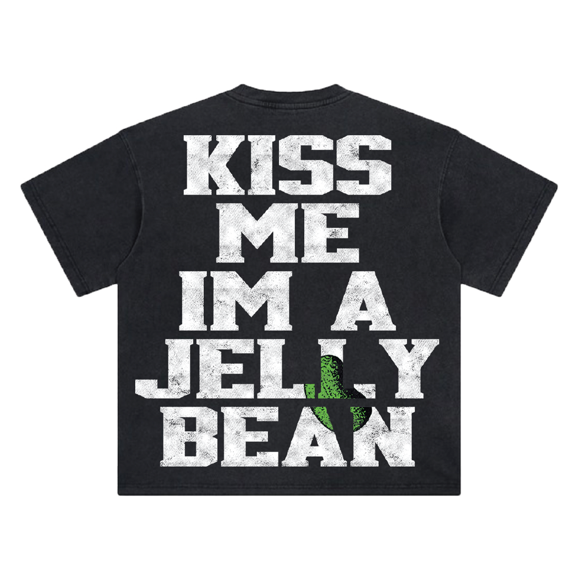 Unique Design: A bold rockstar-inspired face takes over the front, tongue out with a green jellybean pop — topped with a split “JELLY” and “BEAN” logo across the eyes. The back hits hard with “KISS ME I’M A JELLY BEAN” in large, cracked-stone text.